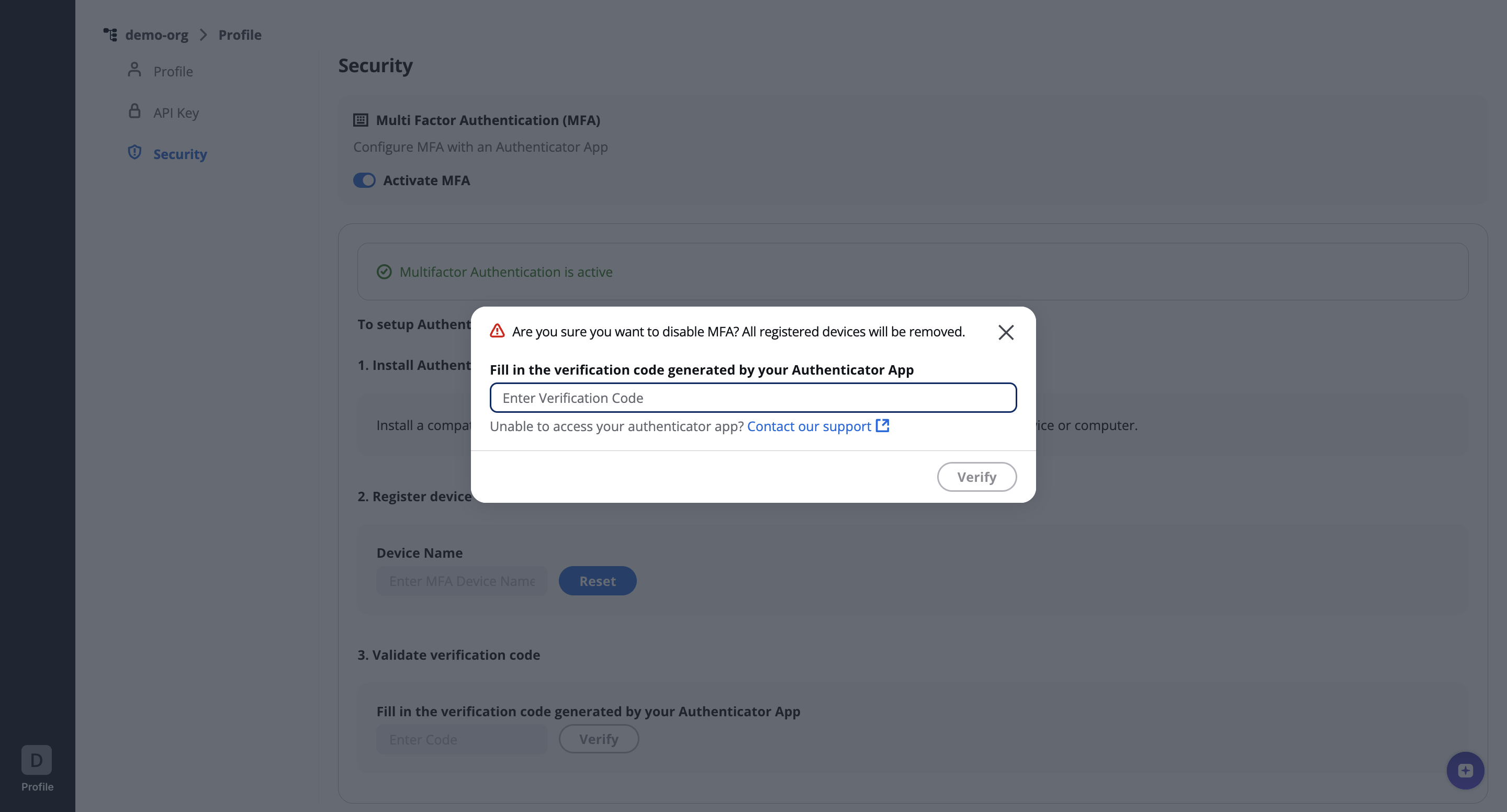 - Confirm the action by entering the code from the auth app.